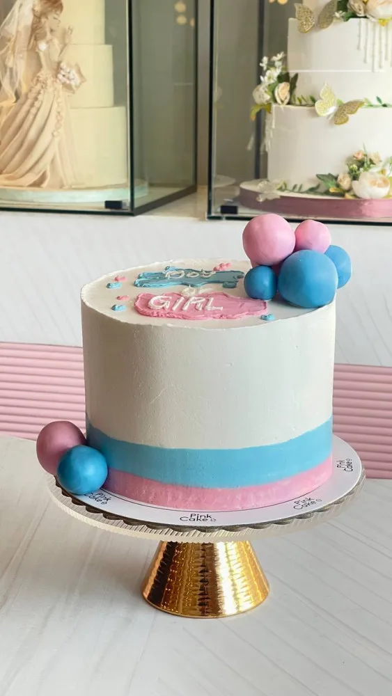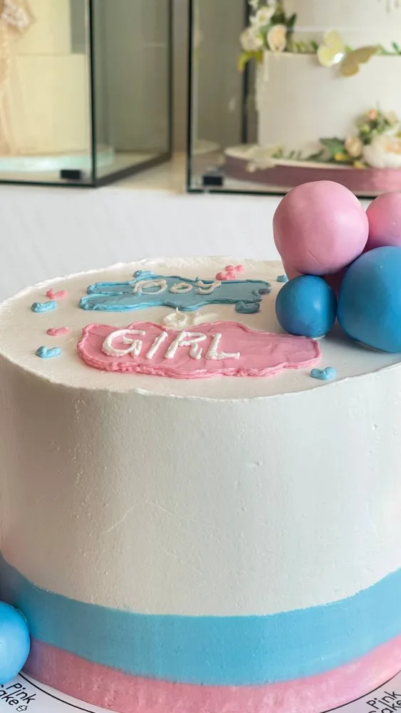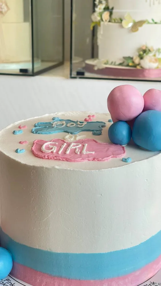 الكيكة تأتي بذوق لذيذ ومُزينة بألوان زاهية تعكس اللحظة السعيدة. يُخفى داخل الكيكة لون خاص، فإذا كان الجنين ولدًا، ستظهر كريمة زرقاء، وإذا كان بنتًا، ستظهر كريمة وردية. هذه المفاجأة تضيف جوًا من الفرح والإثارة بين الأهل والأصدقاء أثناء الاحتفال.
